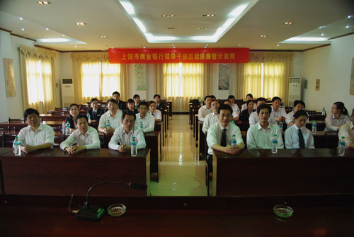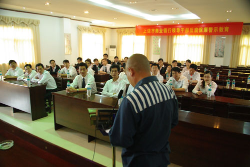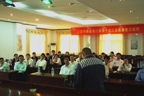 2009年4月28日下午,由徐明監事長、王衛閩紀檢書記帶隊,我行各支行行長及部分員工共31人參觀了江西省饒州監獄,進行反腐保廉警示教育。一行人參觀了罪犯監室、食堂、勞動工廠,聽取了懺悔報告,觀看了監獄日常管理宣傳片,參觀了廉政教育展覽廳,深受教育。